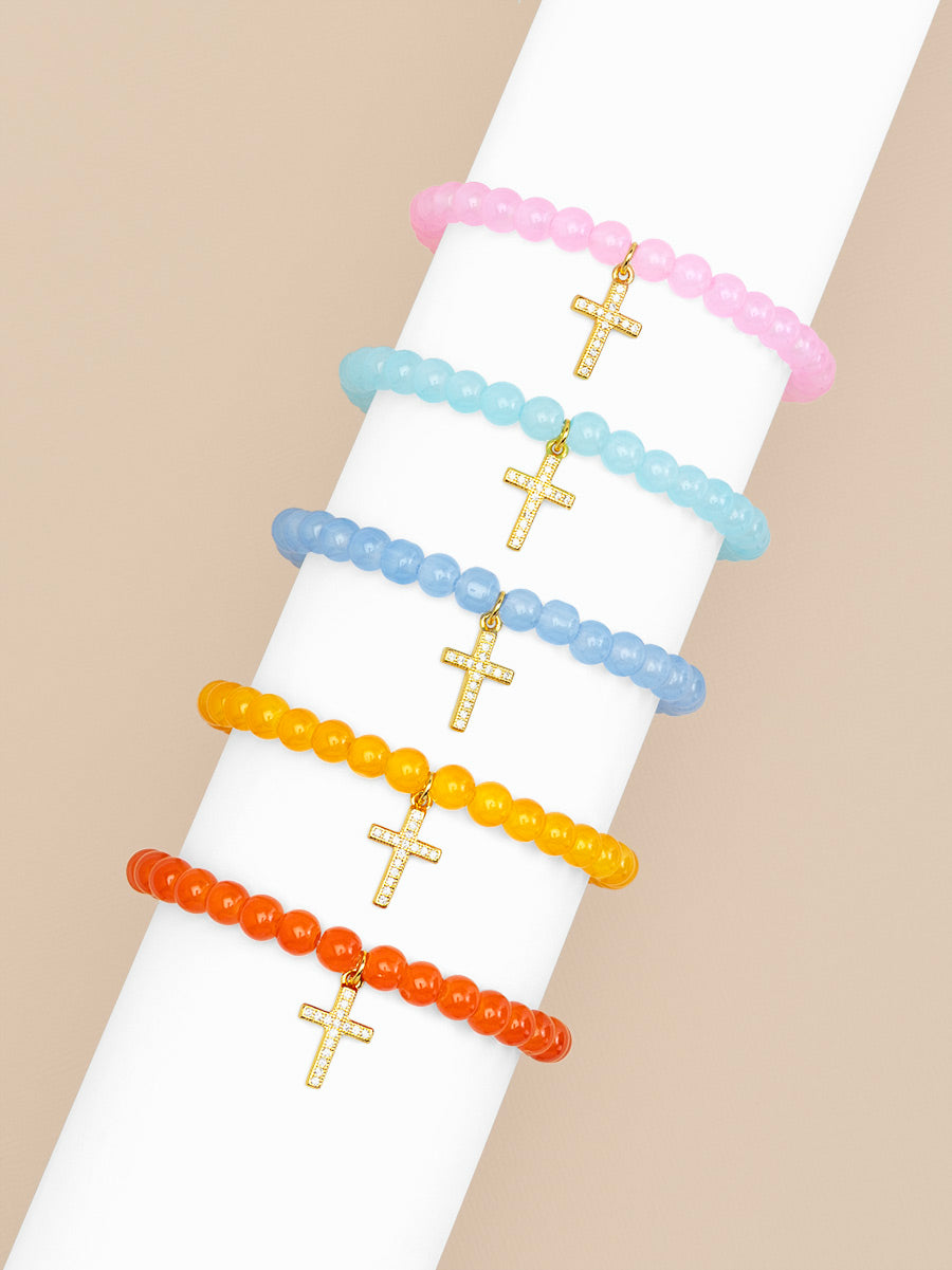 A stretch glass-bead bracelet accented with a small pavé cross charm.