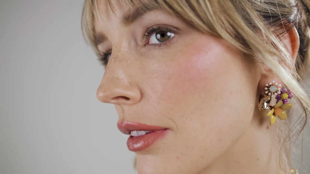 Brass-based stud earring with 18K gold plating, handmade with crystals and enamel flowers.