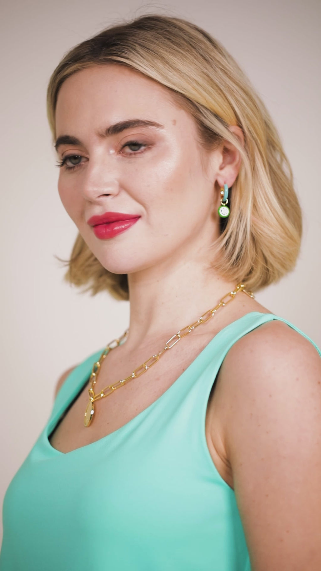 Drop earring composed of enamel and 18K gold-plated metal with an enamel-enclosed crystal drop.
