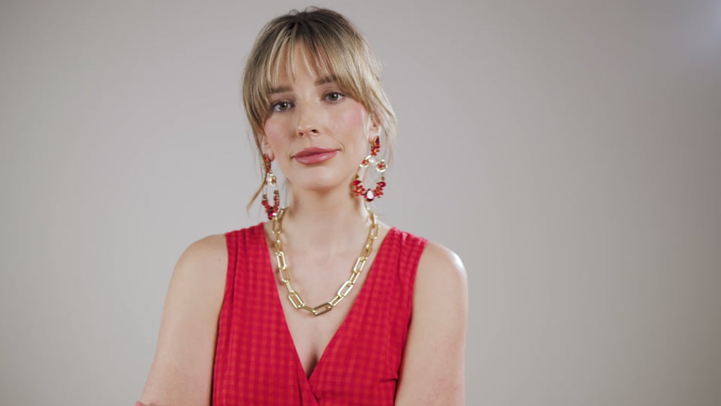 Brass-based drop earring with 18K gold plating, handmade with crystals, enamel flowers, and a hanging pearlescent bead.