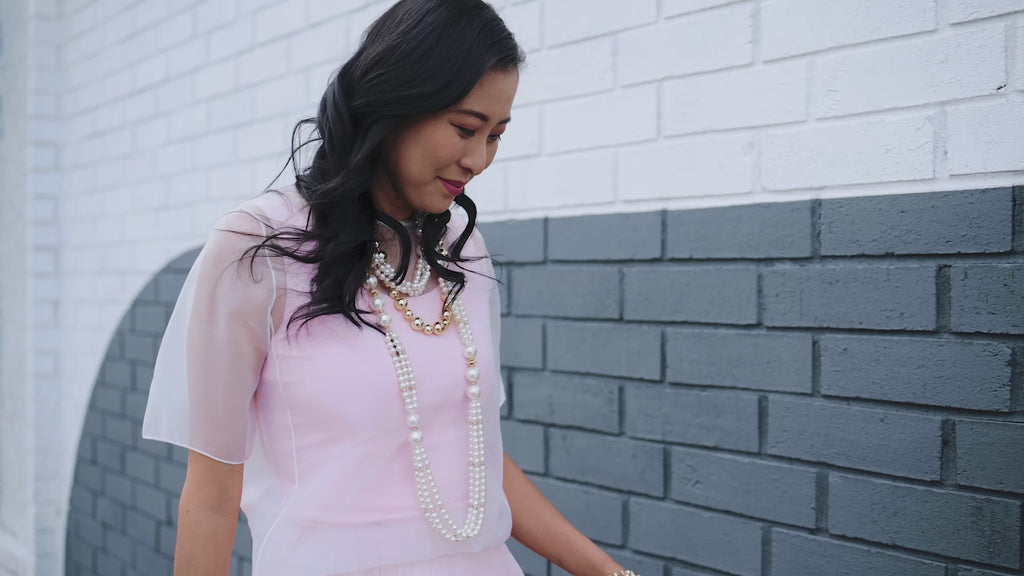 Collar beaded necklace composed of multi-size pearlescent beads and gold embellished spacers.